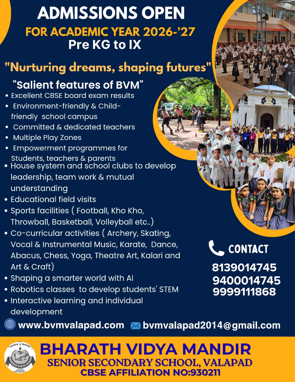 Bharath Vidya Mandir (BVM ) senior secondary School follows the CBSE English Medium Syllabus